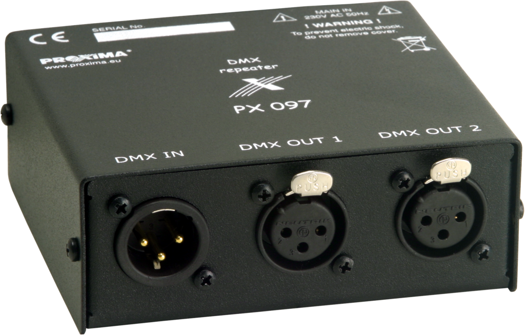 DMX signal repeater and 2-line splitter. Allows to connect another 32 DMX receivers and lenghten the DMX line. The device has an optical isolation between input and both outputs.Version in metal casing.