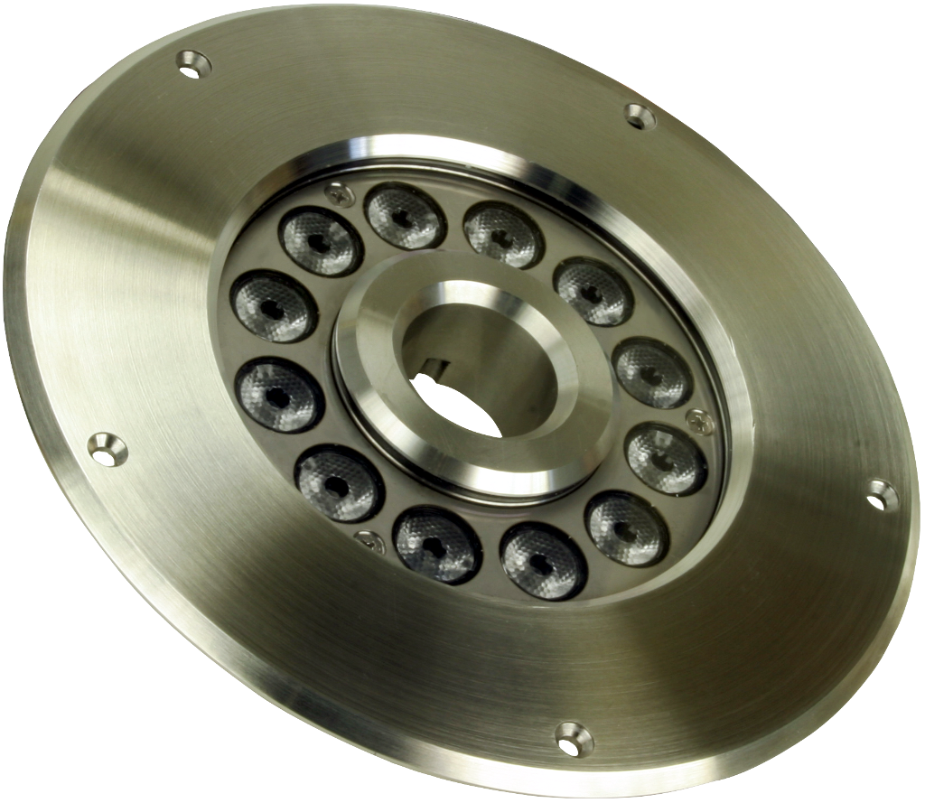 Underwater LED lamp PX246 PxRing 12 S - lighting for fountains.Lamp PxRing 12 S is equipped with 12 high quality Luxeon ® Rebel LEDs. Lamp PX246 is designed for installation in fountains, where the required high brightness illumination. The hole in the middle of the lamp allows you to mount it around the nozzle of the fountain. When connected to an external controller it gives a full spectrum of 16 million colors (in theory).