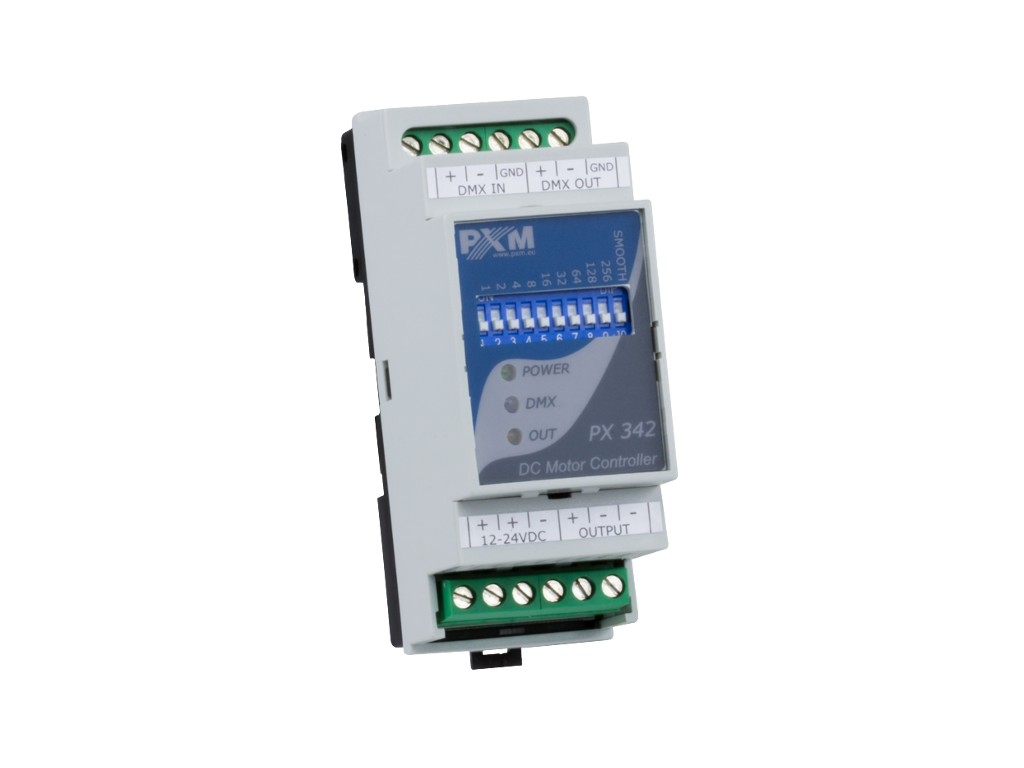The PX342 PWM 10A Driver is a device used to control a single PWM output channel with a maximum load of 10A via the DMX-512 signal.The DMX address can be set through the use of DIP type switches. The same goes for the activation of the "smooth" function.
