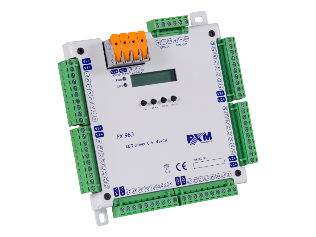 PX963 is a 48-channel voltage driver designed for RGB matrix systems, perfect for controlling lighting of large surfaces composed of many modular elements. An example of this are facades – LED screens.Using the built-in DMX signal receiver, it is possible to control all 48 channels via the DMX protocol. A wide supply voltage range (12 – 24V DC) and high current capacity of the outputs (max. 1A per channel) allow for the connection of large numbers of LEDs – and thus the effect of uniform illumination of the entire surface. The device is equipped with a special high-current connector for connecting the power supply. The interpolated output control resolution of 16 bit makes the brightness control of individual channels completely smooth. An additional advantage is the implementation of modern "flicker free" technology, i.e. the possibility of selecting a 0.125 to 20kHz frequency, with its help the PX963 driver can be successfully used in installations created for the needs of the television industry. In addition, the RDM protocol has been implemented in the PX963. The device is equipped with a large LCD display (2 x 16), an intuitive menu and 4 buttons, which makes configuration easier.